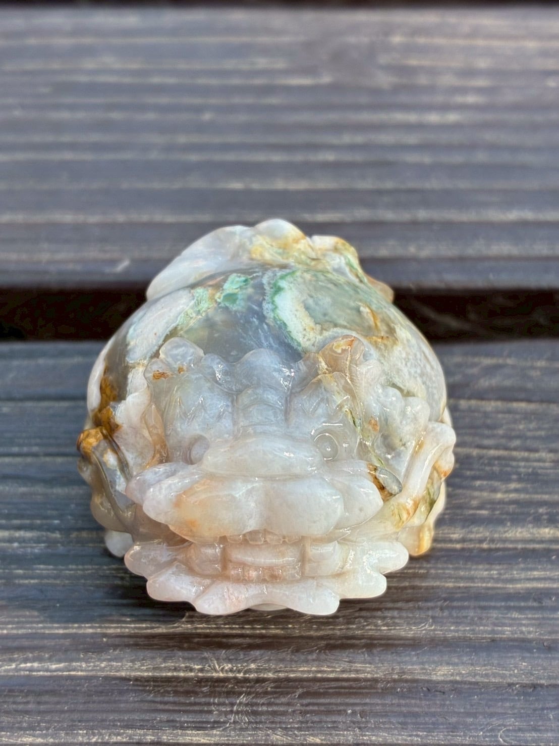 世界地図のような背面の模様が個性的なフラワーアゲート(桜瑪瑙)の龍亀ちゃんです。