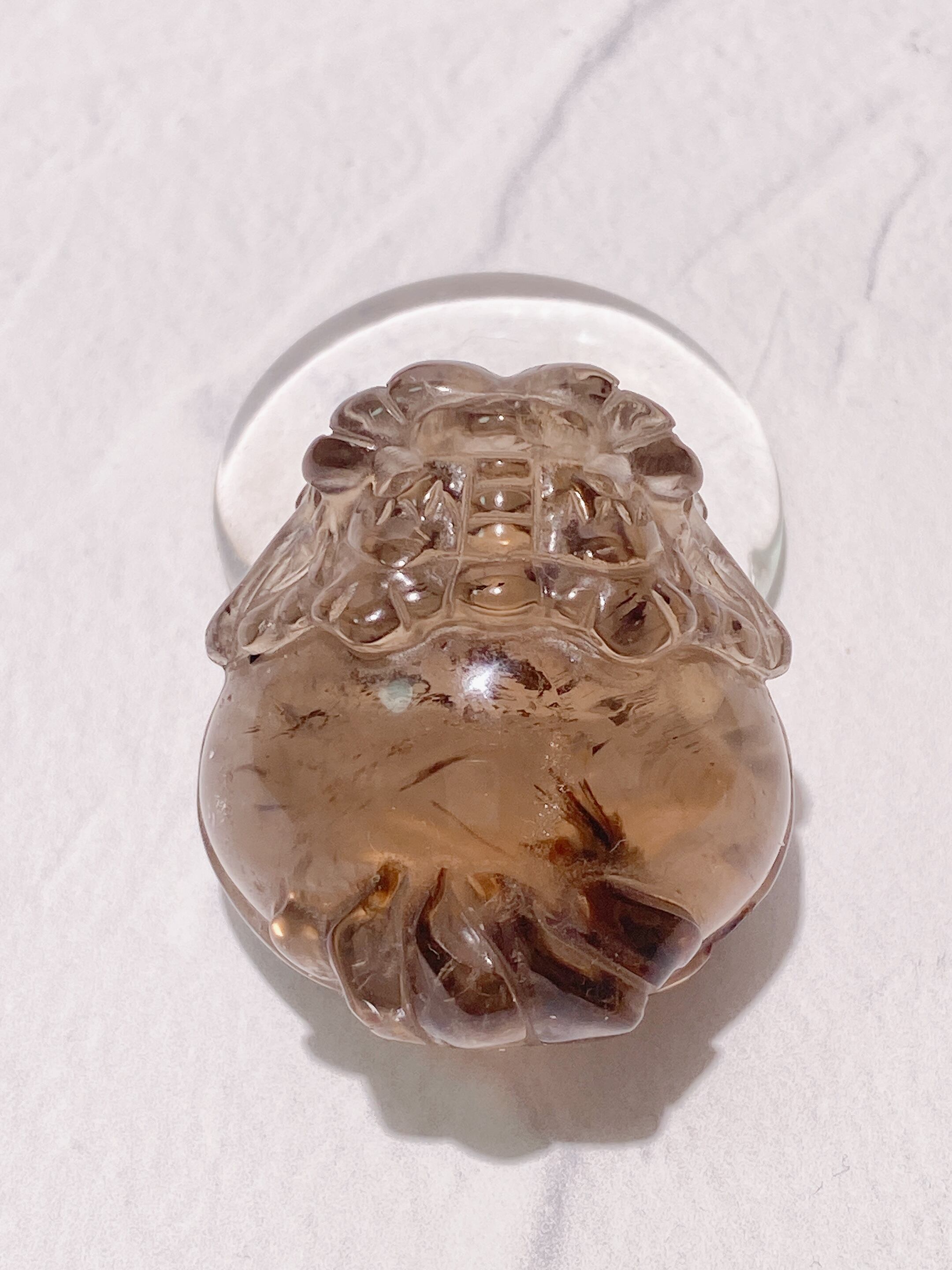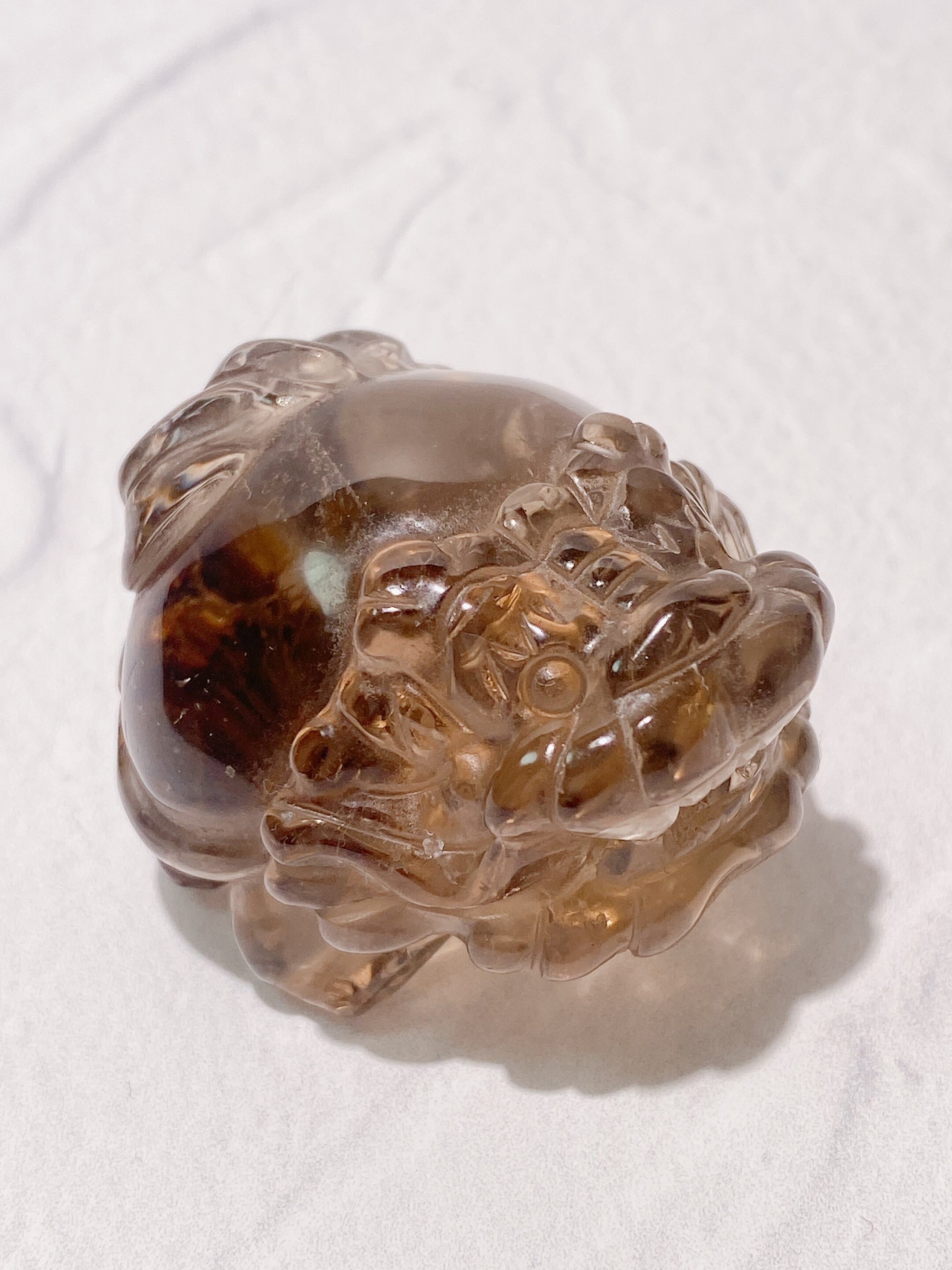 よく見ると太陽ルチルが共生している珍しいスモーキークォーツの龍亀ちゃん。