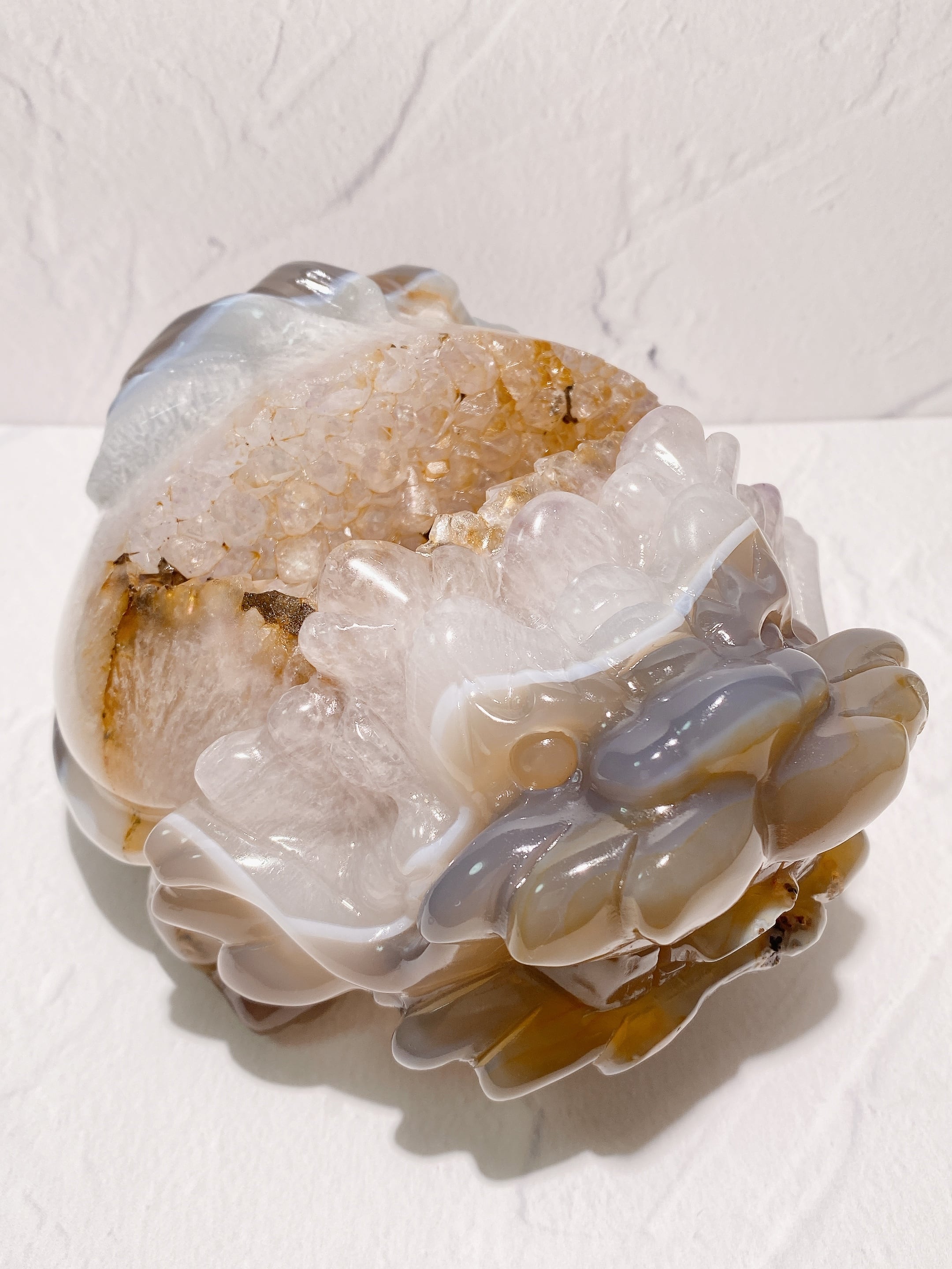 天然石の表面に細かな結晶が集まってできたドゥルージーアゲート。その空洞は『龍穴』と呼ばれ、龍が出入りする穴を意味するそうです。