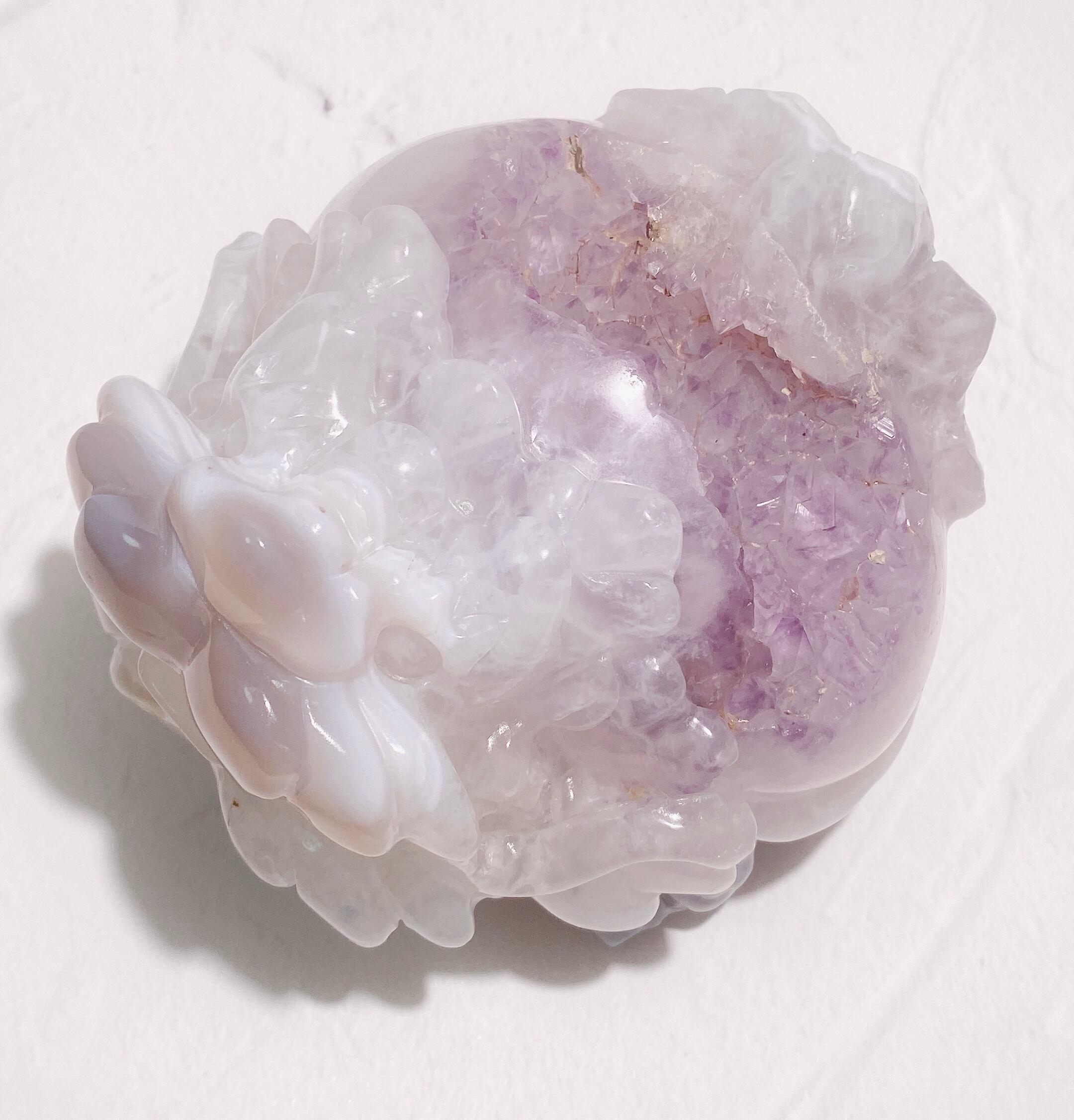 天然石の表面に細かな結晶が集まってできたドゥルージーアゲート。その空洞は『龍穴』と呼ばれ、龍が出入りする穴を意味するそうです。