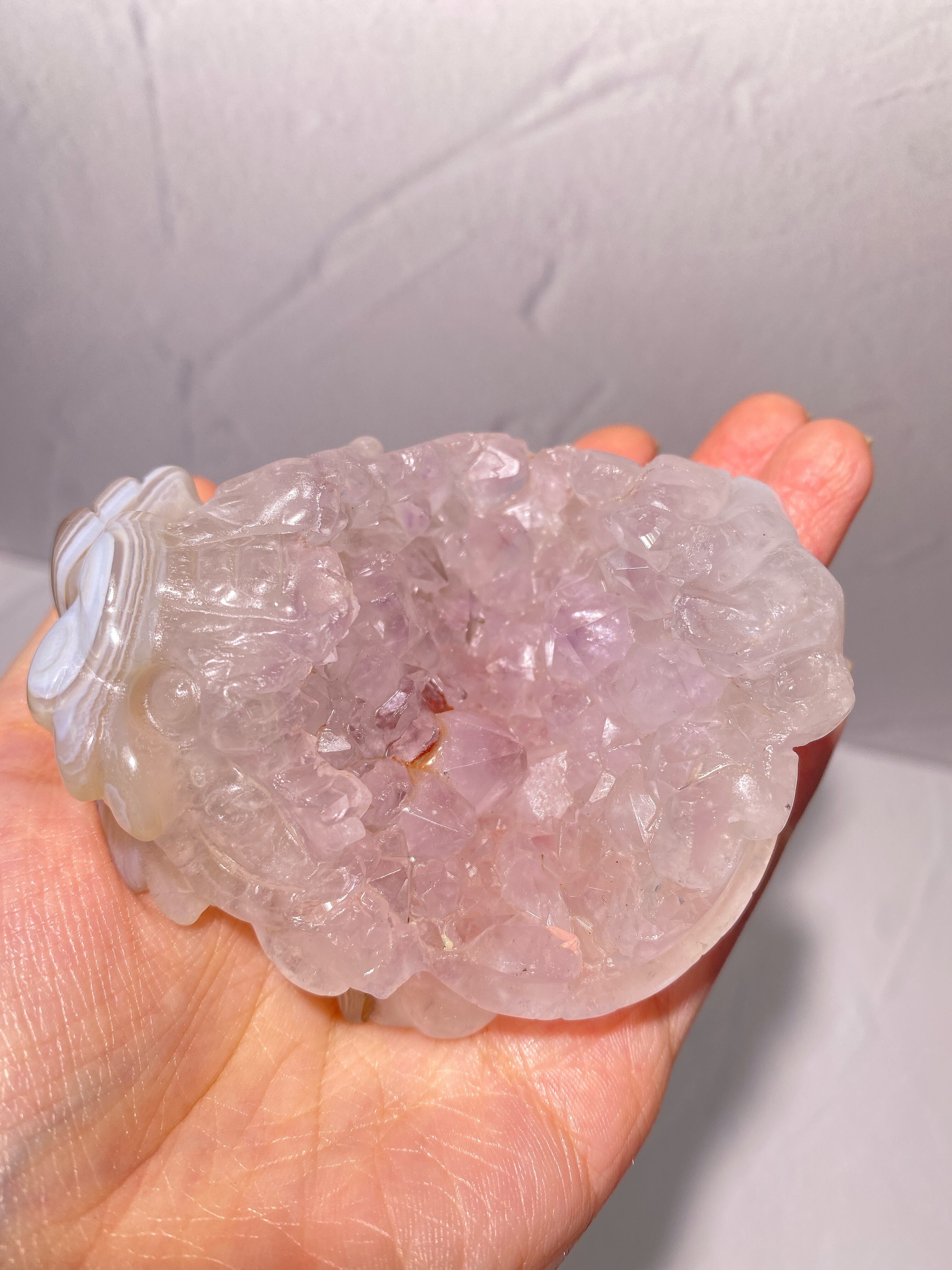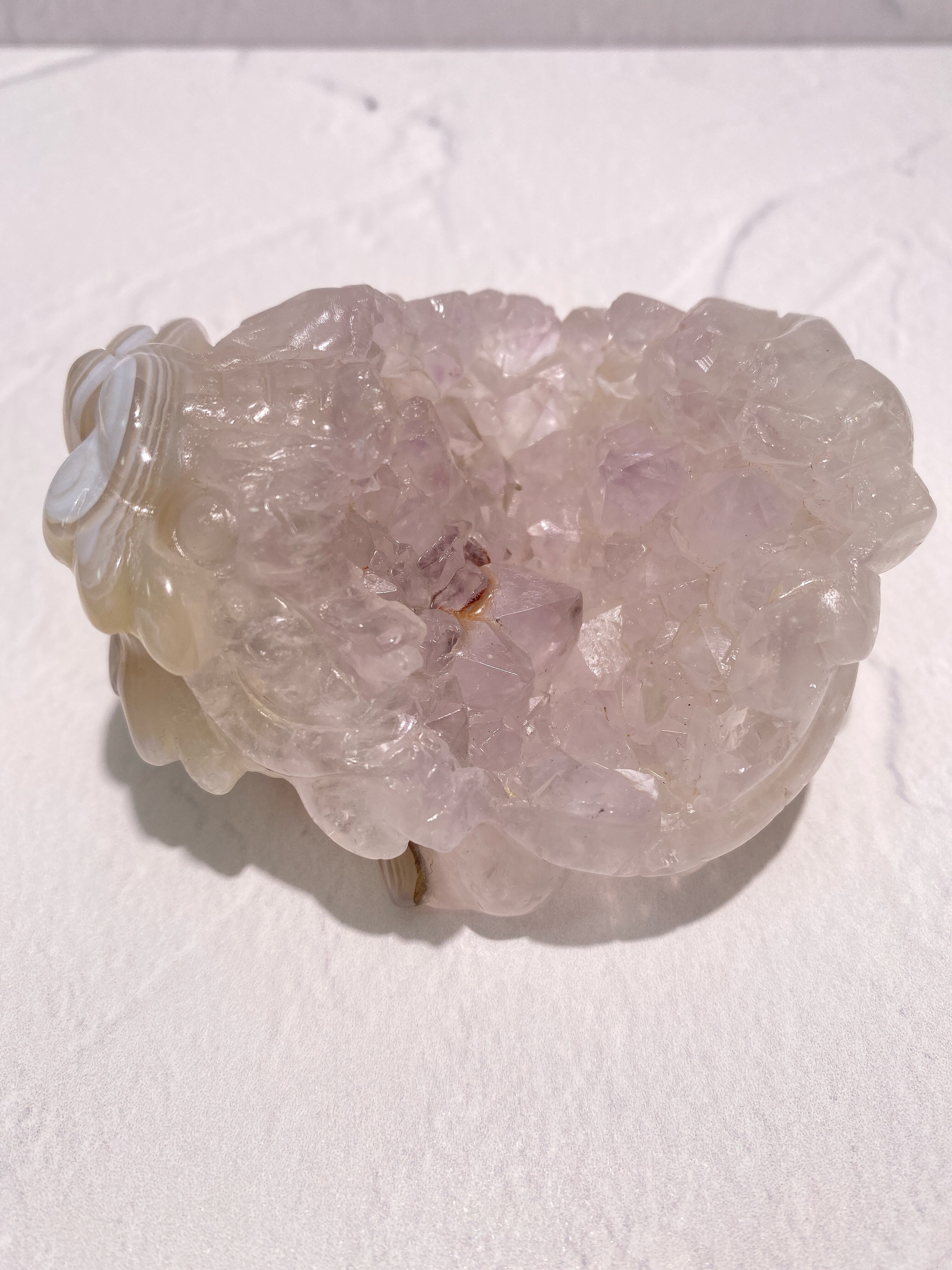 天然石の表面に細かな結晶が集まってできたドゥルージーアゲート。その空洞は『龍穴』と呼ばれ、龍が出入りする穴を意味するそうです。