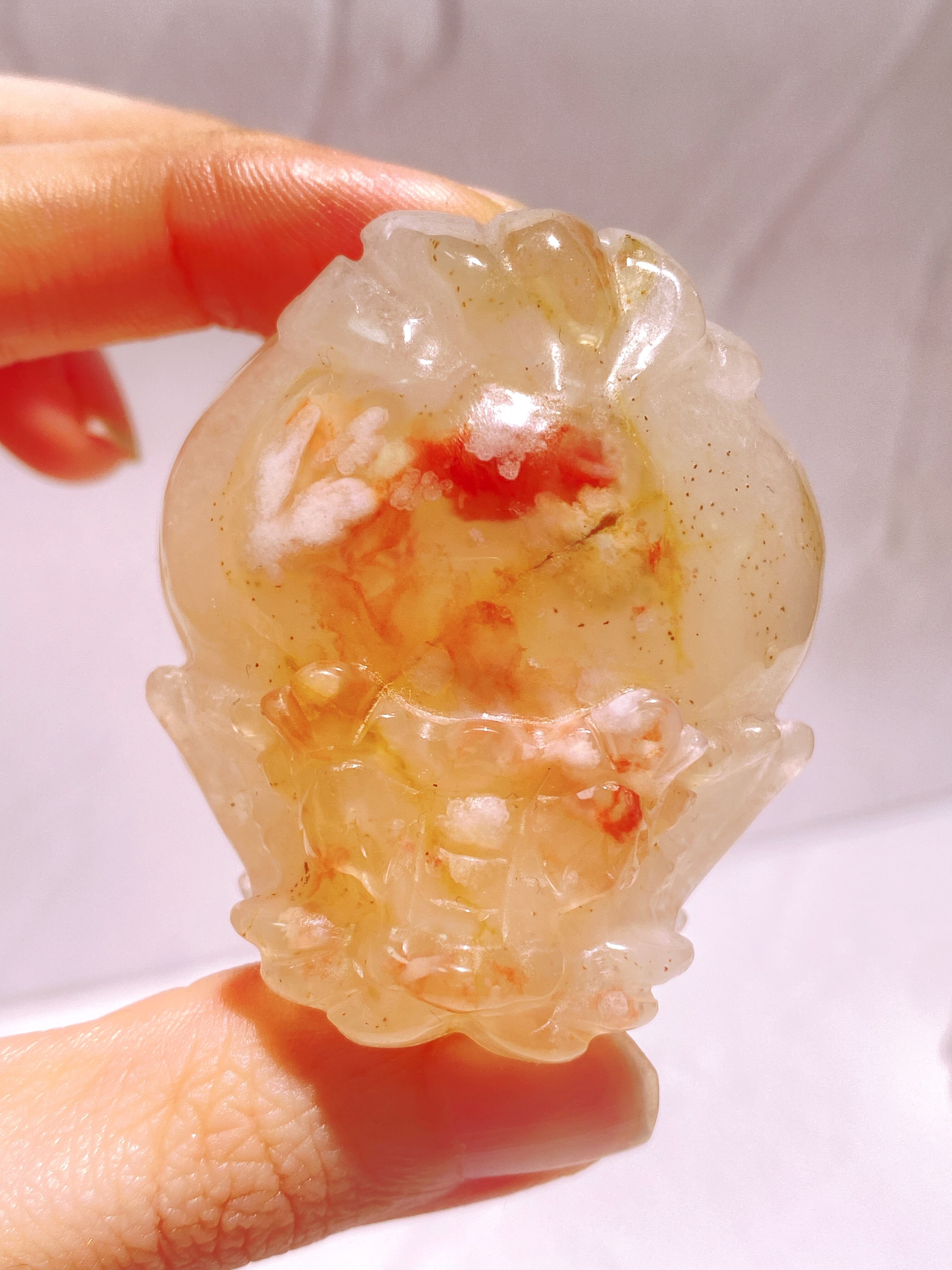透明感のある優しいオレンジの中に、鮮やかな朱色のワンポイントが映える、素敵なフラワーアゲートの龍亀ちゃんです。