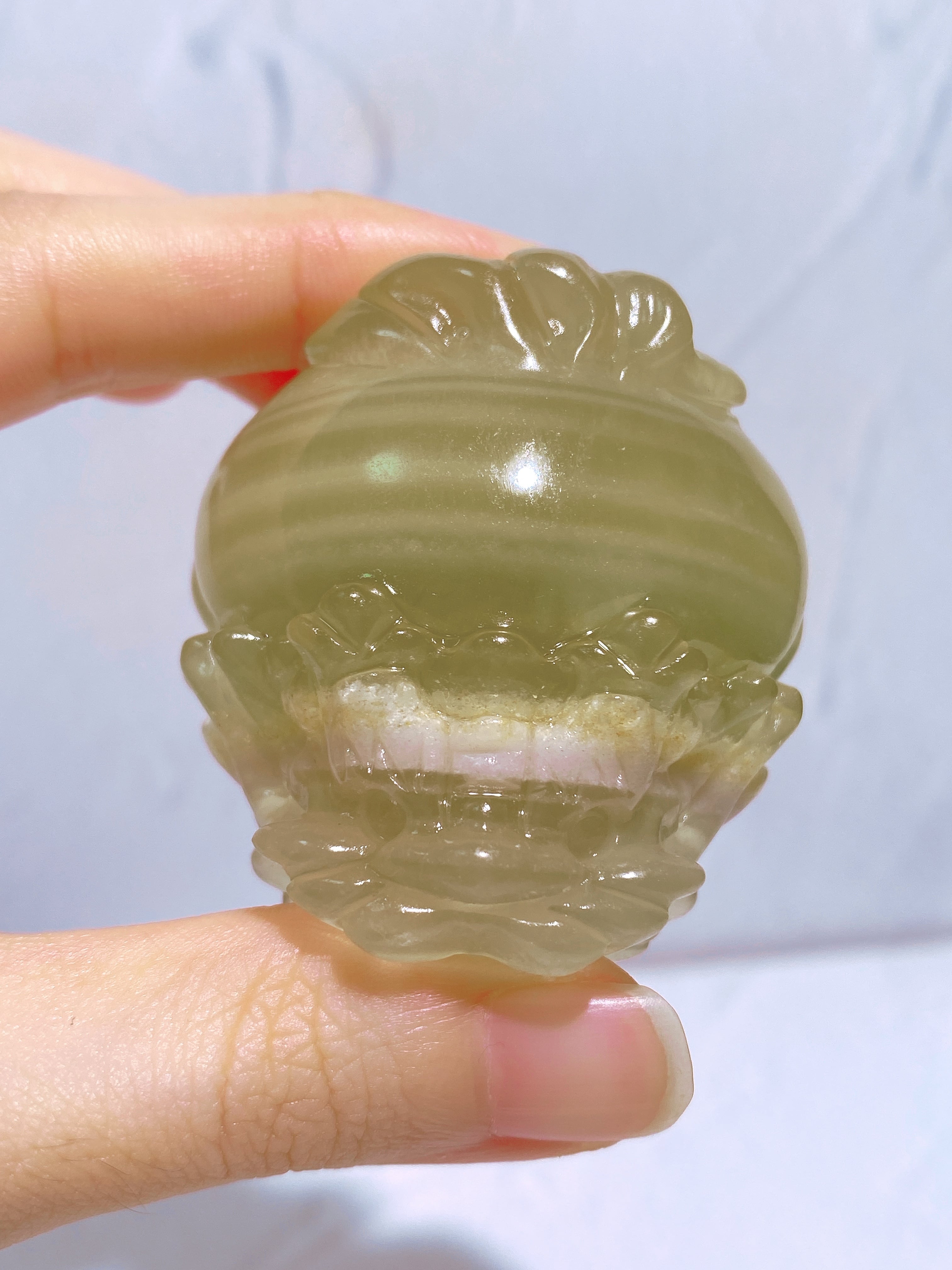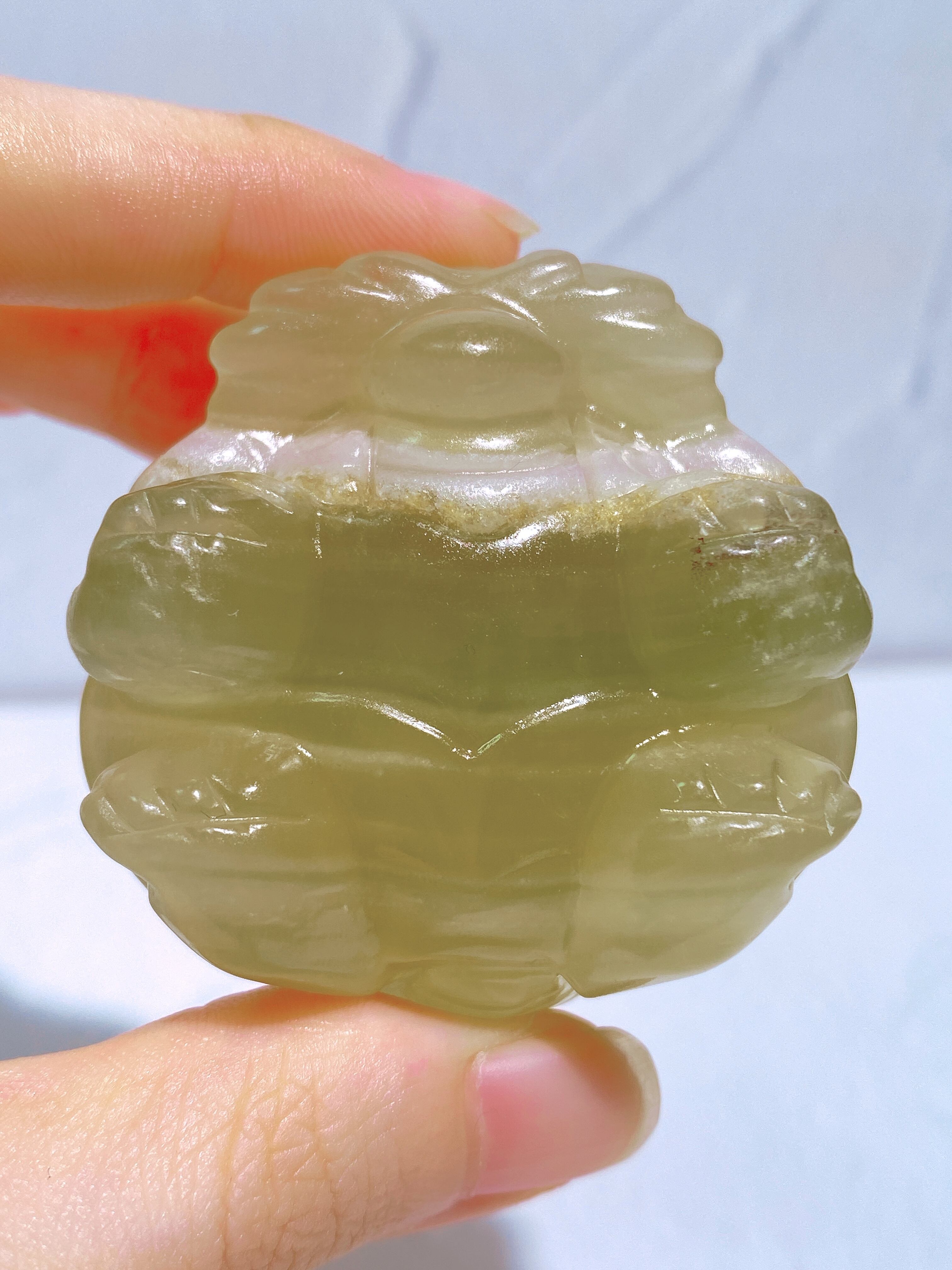 まるでピンクのマフラーを巻いているかのように、首元に個性的なワンポイントが入ったイエローフローライトの龍亀ちゃんです。