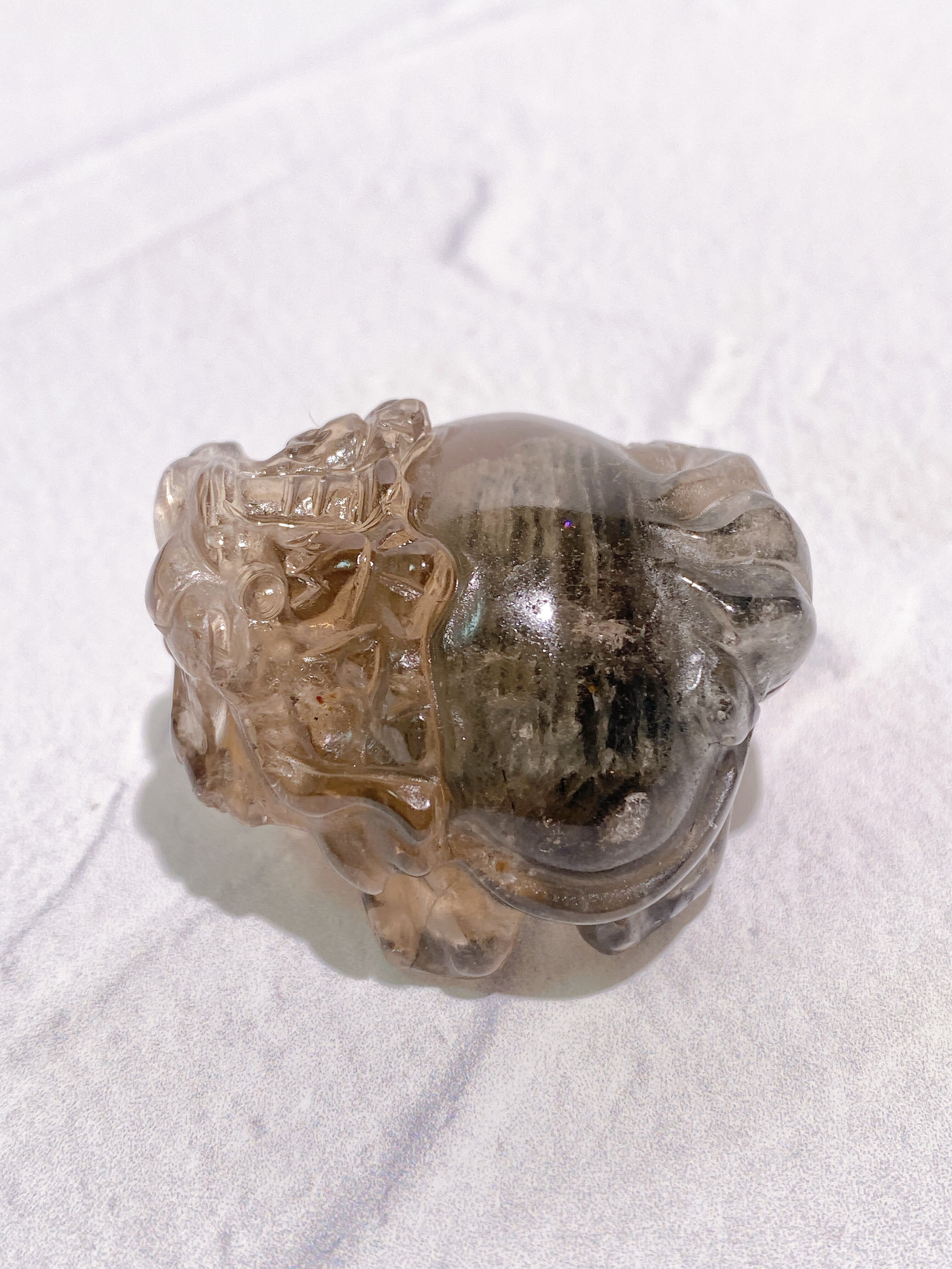 美しいスモーキークォーツにくっきりと分かりやすく層状の内包物が入った千層ガーデンスモーキークォーツの龍亀ちゃん。