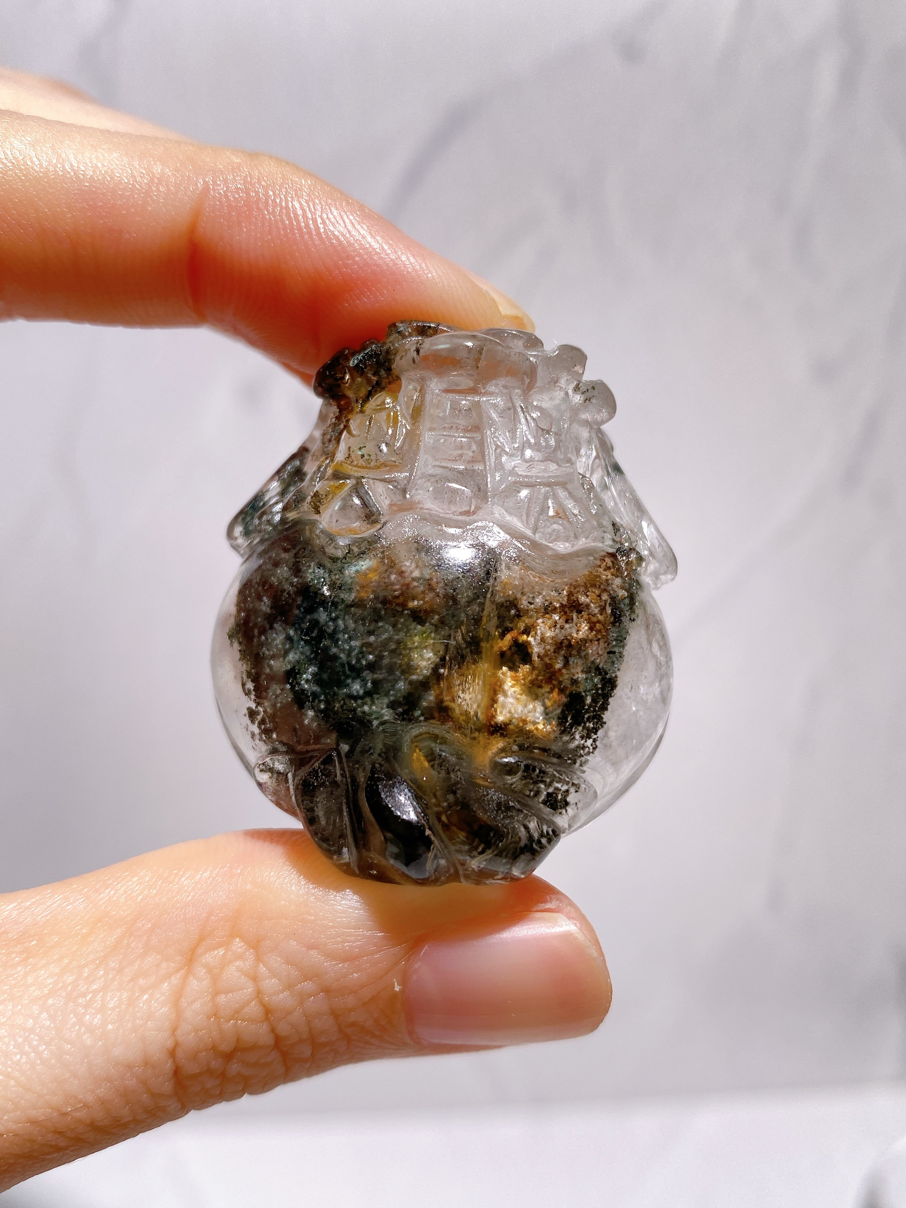 奥行きのある濃いグリーンの内包物が美しいガーデンクォーツの龍亀ちゃんです。