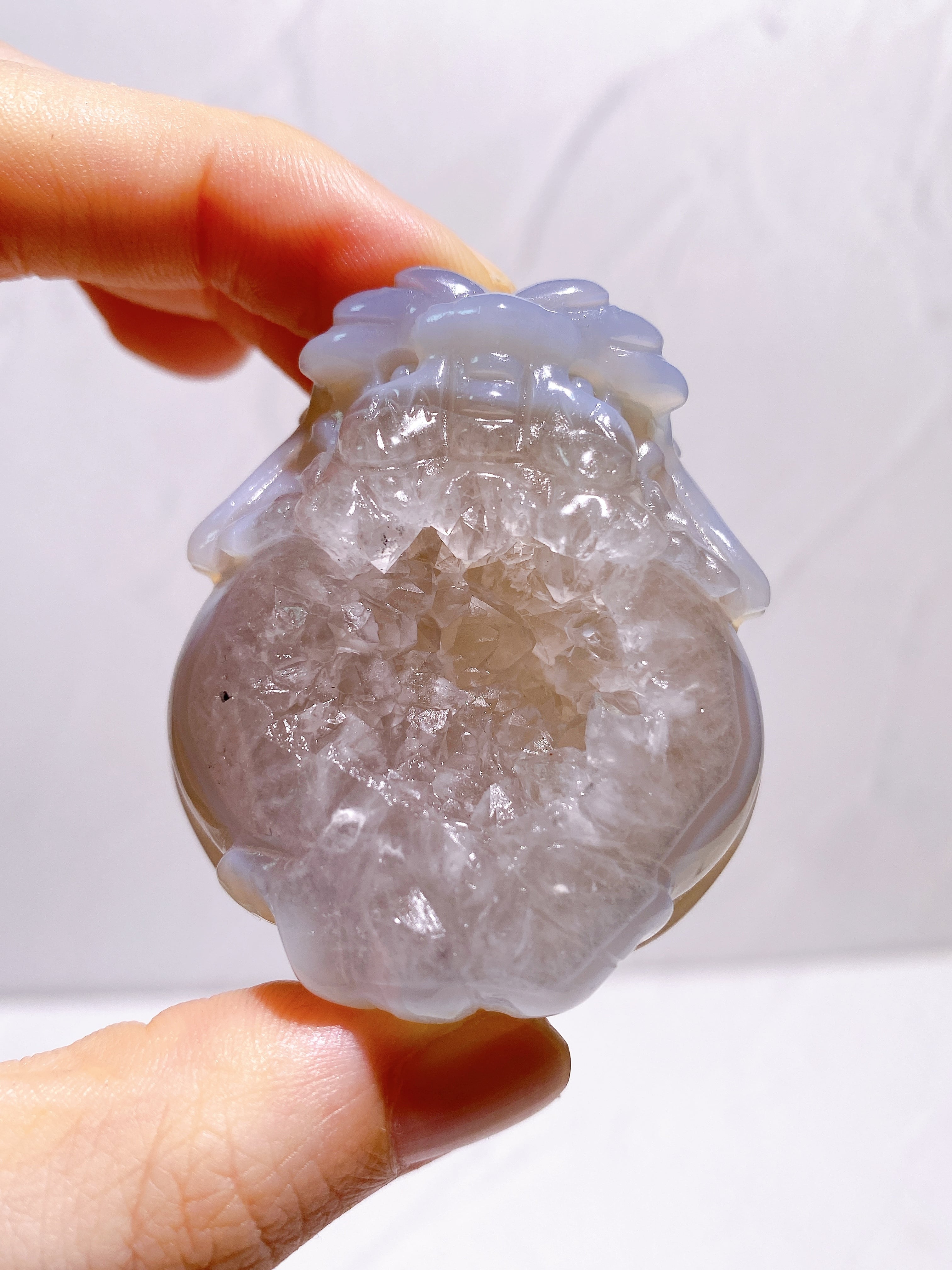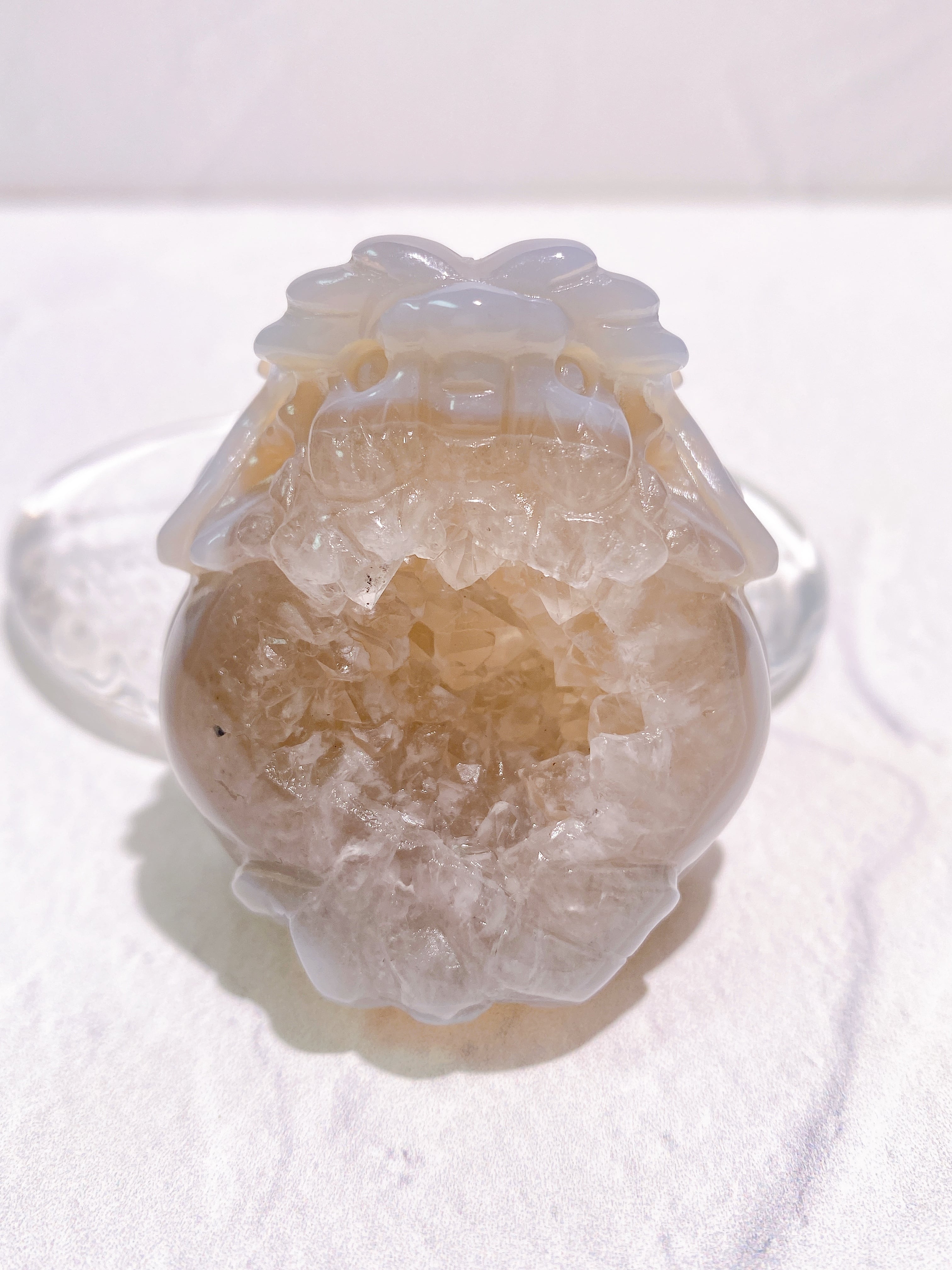 天然石の表面に細かな結晶が集まってできたドゥルージーアゲート。その空洞は『龍穴』と呼ばれ、龍が出入りする穴を意味するそうです。