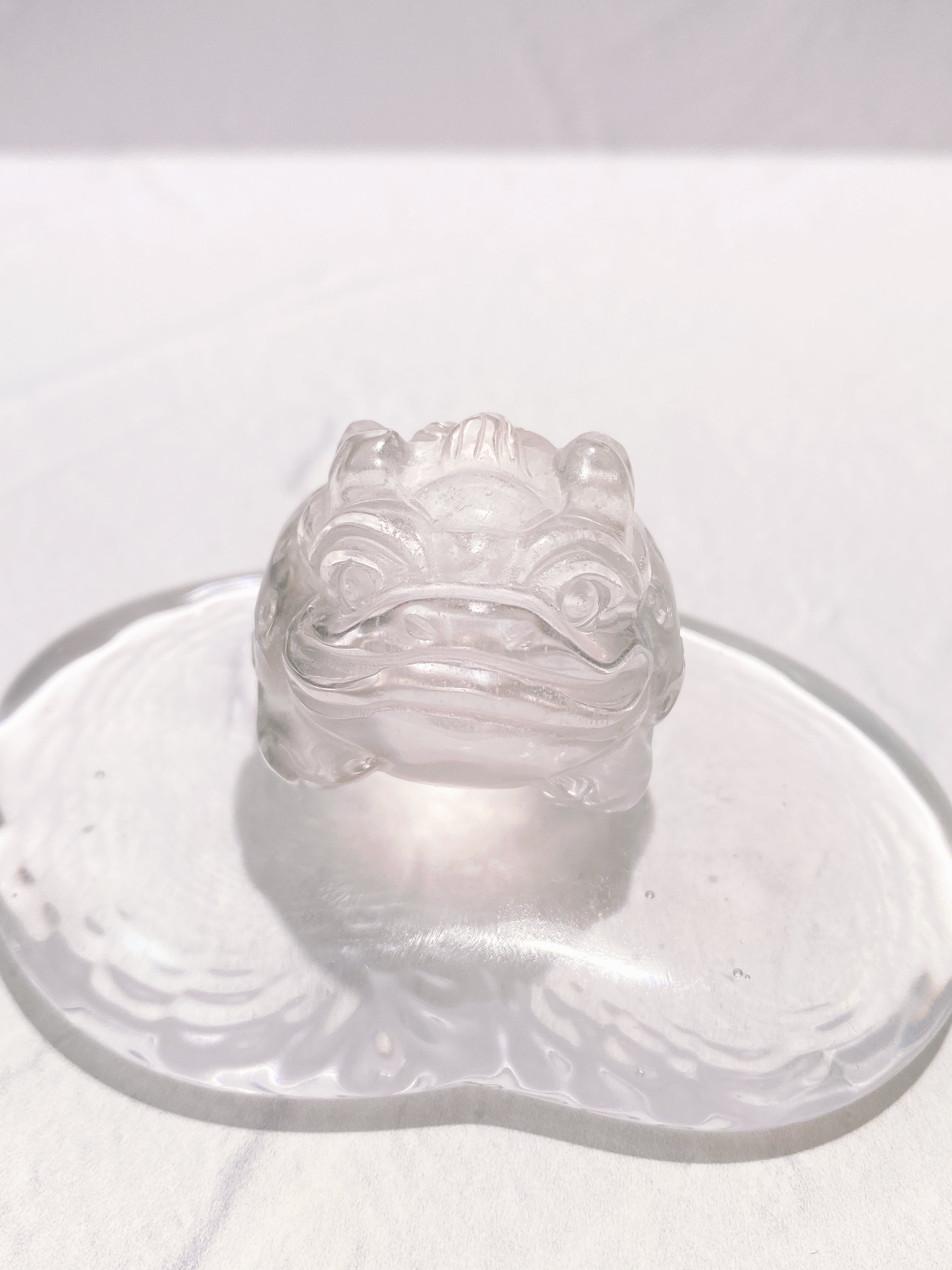 こちらは光の反射率が高く、まるで内側から発光しているようにも見える高品質なクリアクォーツの金蟾ちゃんです。