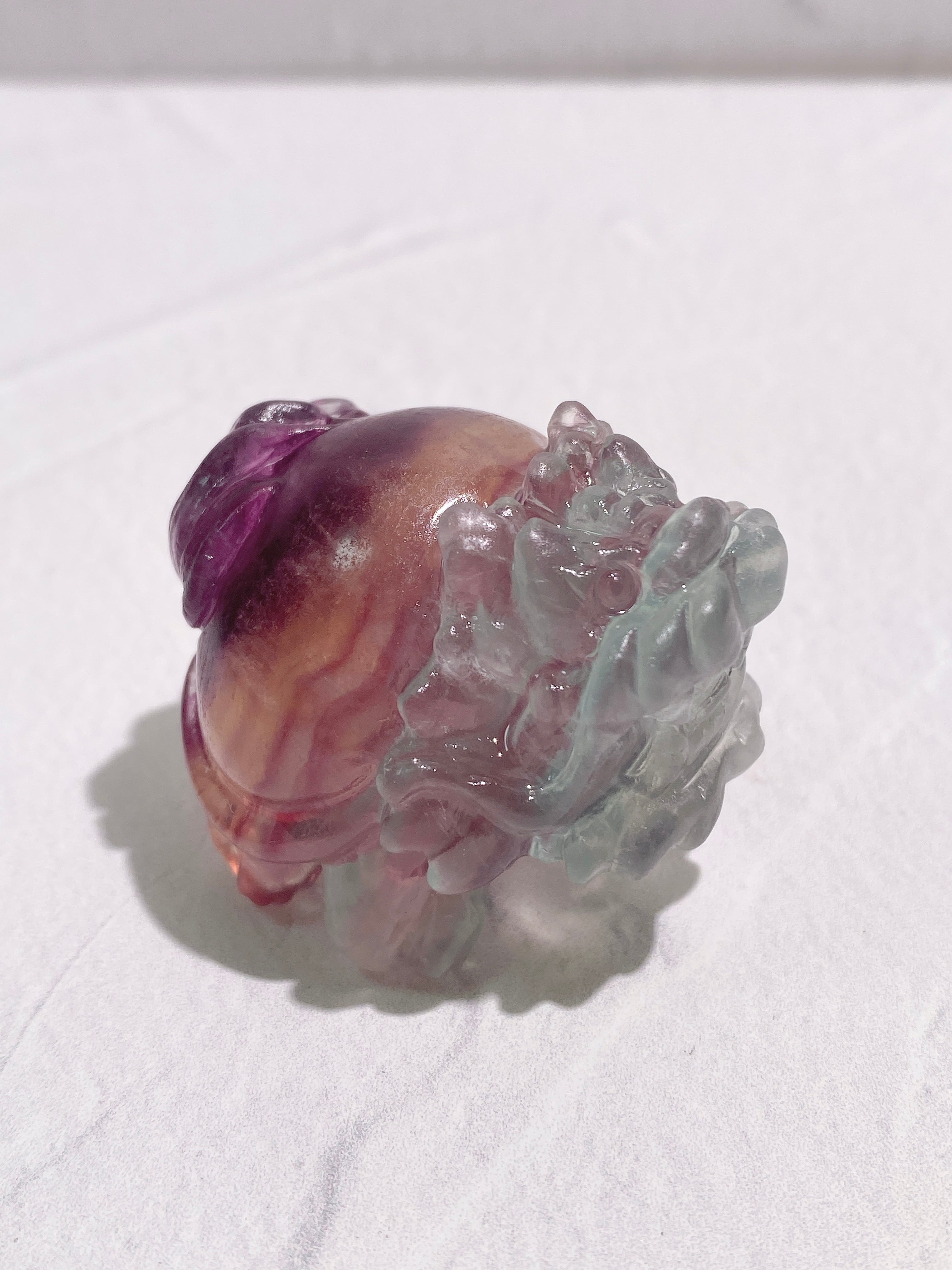 氷のように美しいレイクブルーからイエロー、パープルへとグラデーションしていく素敵なフローライトの龍亀ちゃんです。