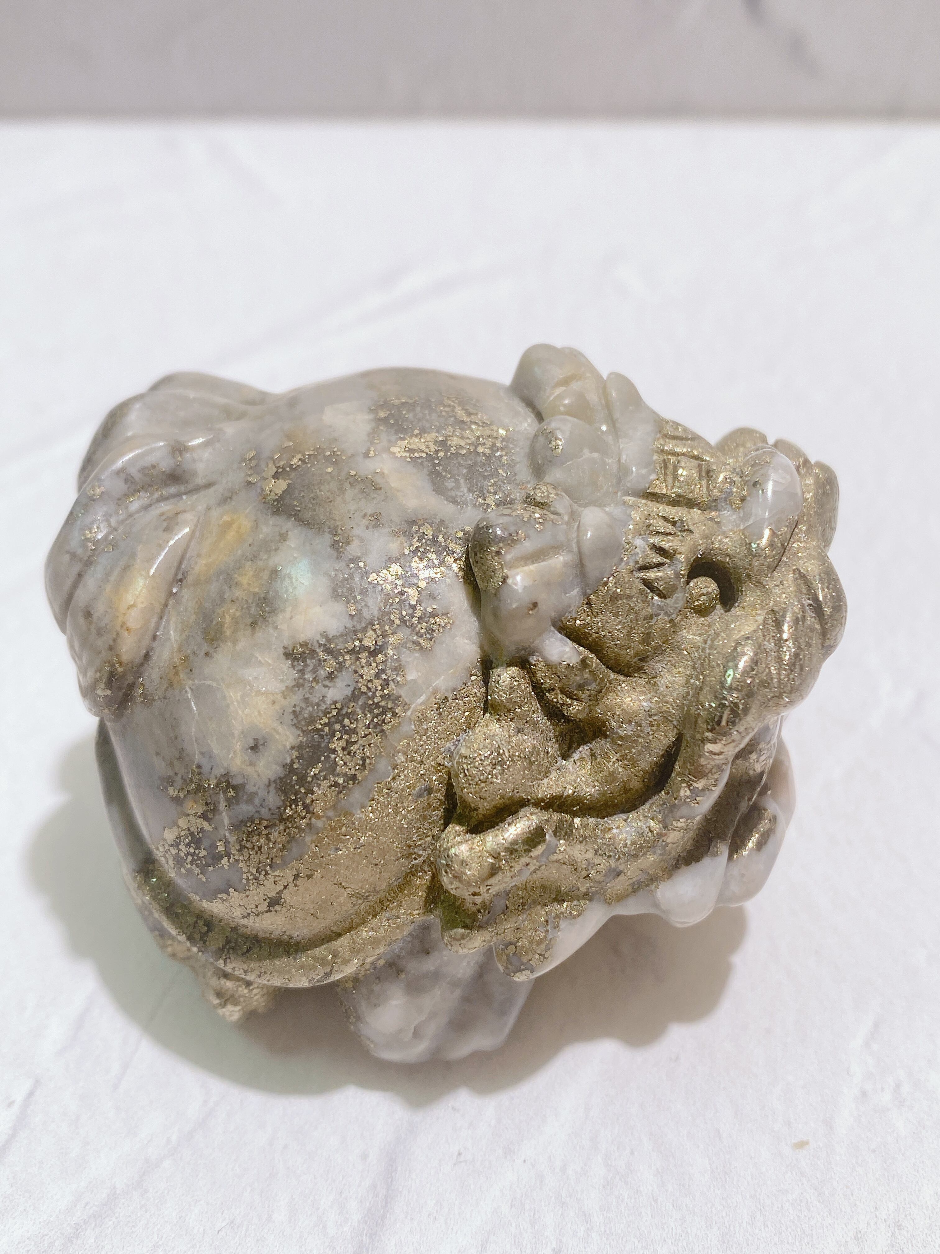 キラキラのパイライトとカルサイトが絶妙なバランスで共生した、可愛いマーブル模様の龍亀ちゃんです!