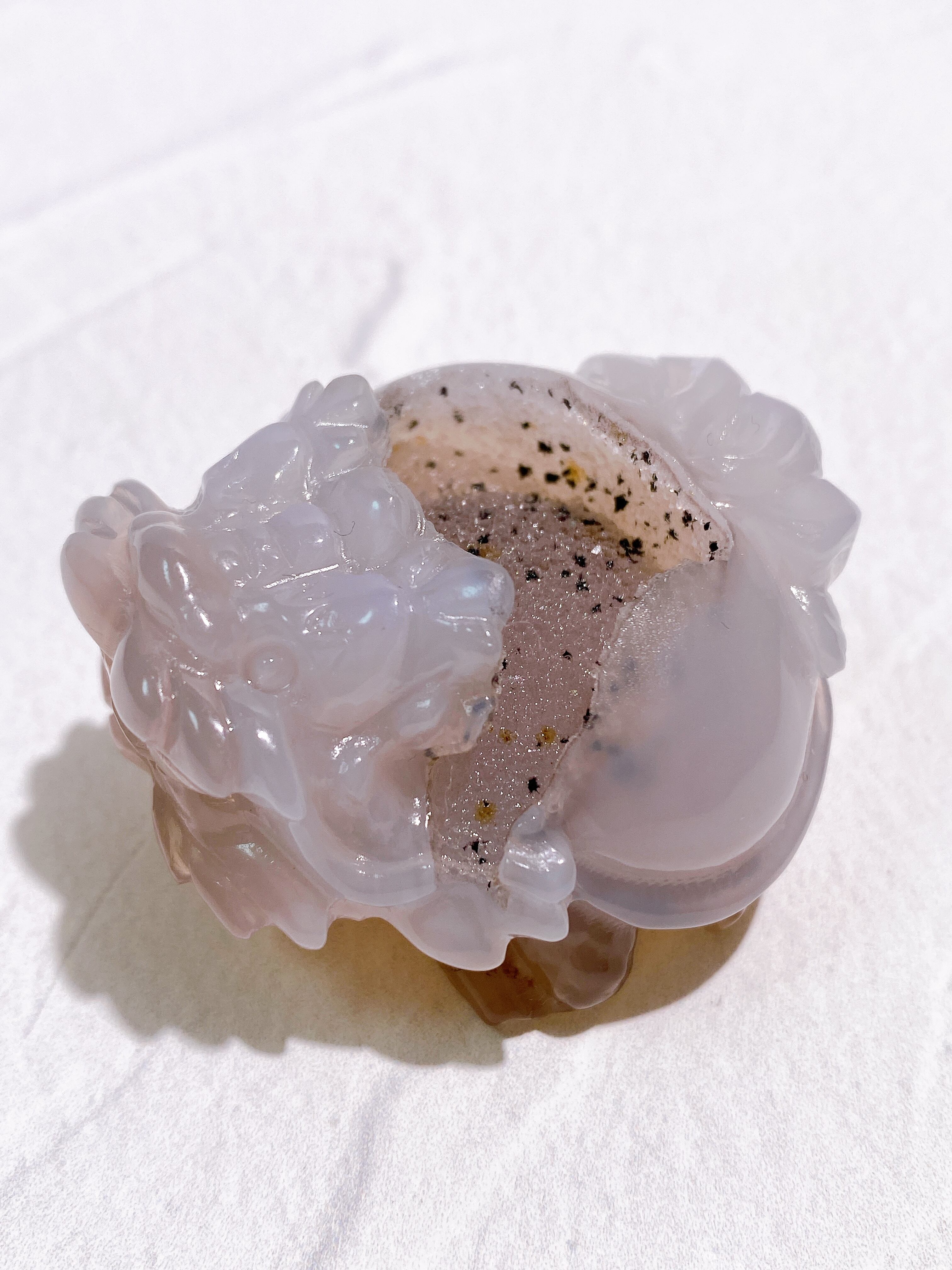 お砂糖のような細かい結晶が晶洞の内部に密集した、とっても可愛いシュガードゥルージーアゲートの龍亀ちゃん。