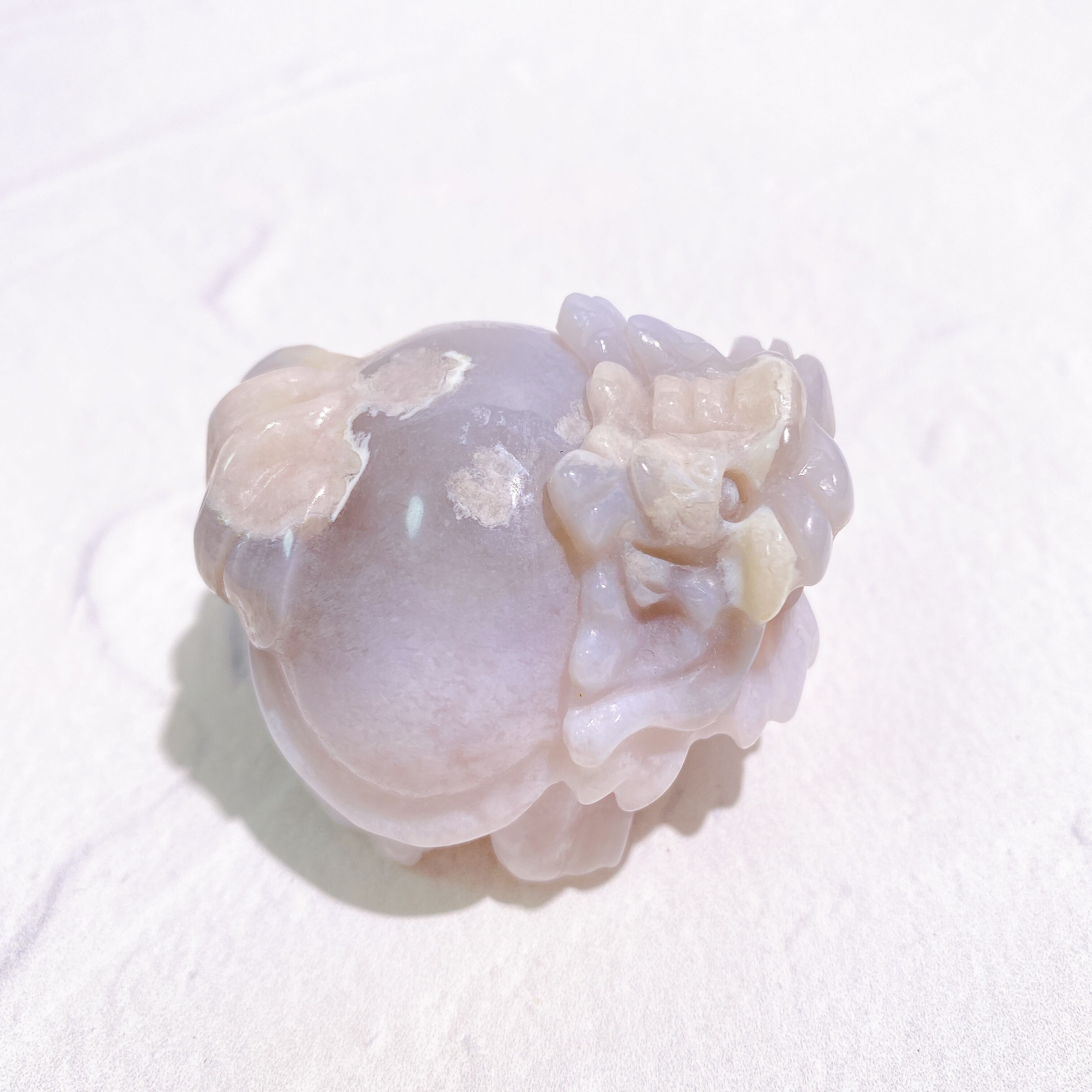 グレイッシュパープルの優しいお色味と、お尻と頭に入った大きめのお花模様が可愛らしいフラワーアゲートの龍亀ちゃんです。