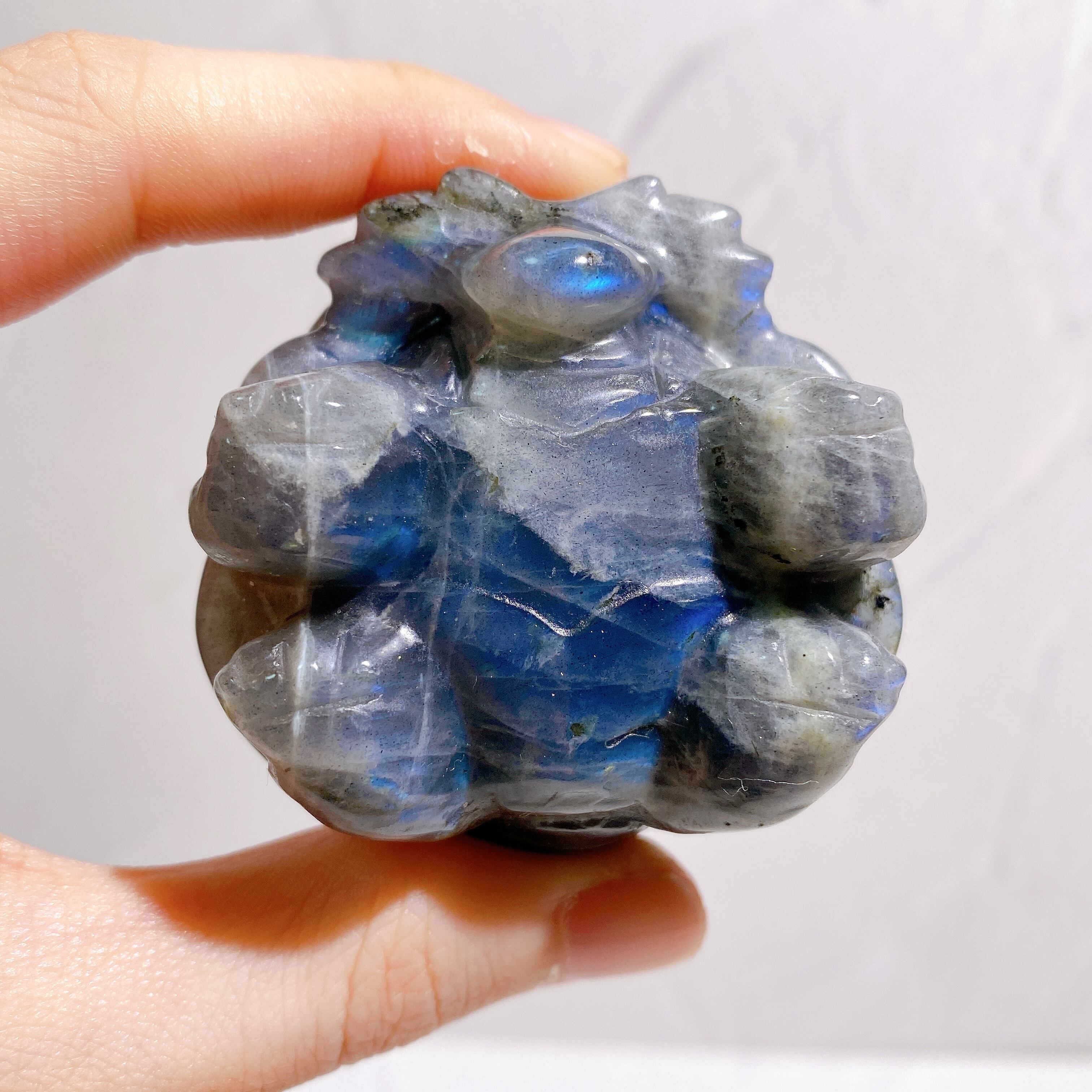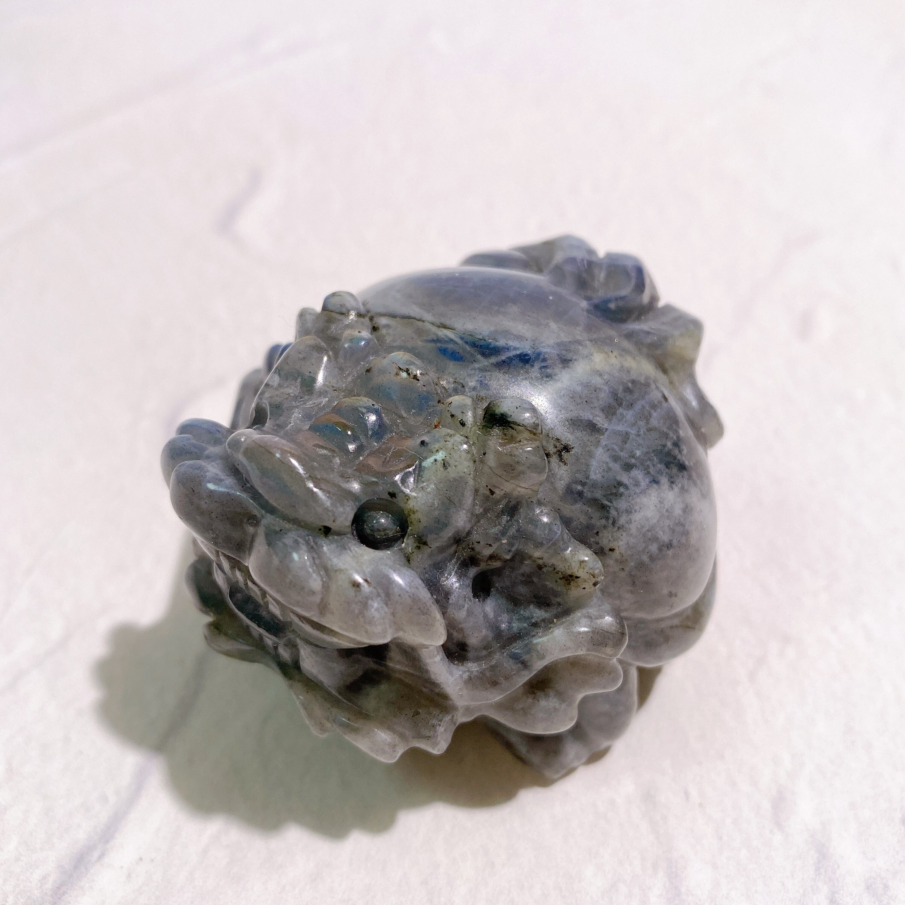 ラブラドライトの龍亀ちゃんは表面に細かな傷がついている個体が多く見受けられますが、こちらは非常に丁寧な研磨が施されており、触ってみてもツルツルです!
